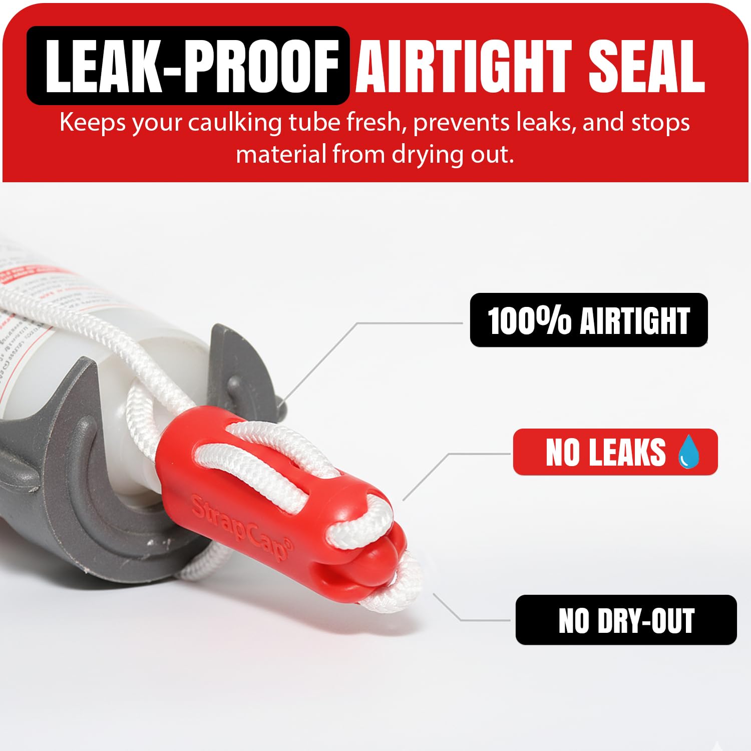 StrapCap Caulking Tube Cover (2-Pack, Red) - Leak-Proof Silicone Cap with Strap Design for Easy Storage, Durable Sealant Preservation, Fits Standard Tubes - Keep Caulk Fresh and Prevent Spills